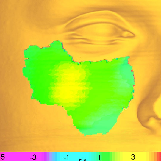 The orange area is the mismatch when compared to the contralateral side. The surgeon marked in black the extent that he wanted to repair. The white contour is the final implant that was made.